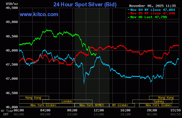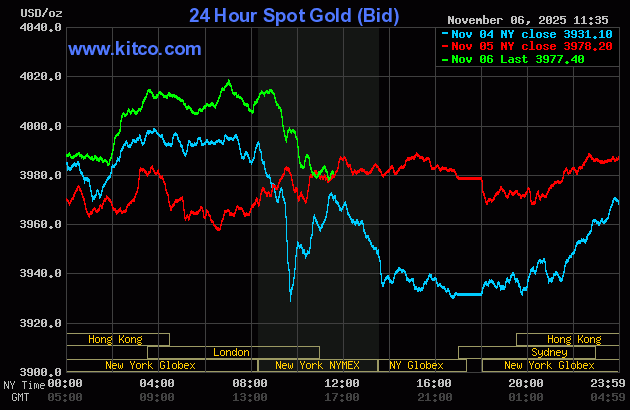 (Kitco News, Thurs. Nov. 6th, 2025) – Gold and silver prices are weaker and have lost earlier gains amid selling pressure across most of the raw commodity futures markets today. A sharp sell off in the U.S. stock market today is not helping out the safe-haven metals—at least not yet. Neither is a lower U.S. dollar index and a did in U.S. Treasury yields. December gold was last down $6.10 at $3,986.30. December silver prices were down $0.382 at $47.635.