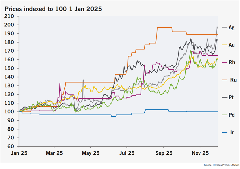 And while the platinum market looks to be the tightest of the major PGMs in 2026, Heraeus analysts said lower demand will result in a smaller deficit. “This is also the case for palladium and rhodium owing to the ongoing decline in sales of combustion engine light vehicles as BEVs continue to gain market share,” they wrote. “Of the small PGMs, ruthenium has a tighter market than iridium as the data center buildout supports hard disk drive demand, although here too the price may have got ahead of itself.”