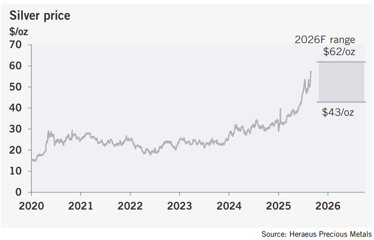 Heraeus forecasts the silver price to trade between $43 and $62 per ounce in 2026. “Ultimately, silver is a higher beta, i.e. more volatile, investment than gold,” the analysts said. “The drivers of the gold price, namely, economic and geopolitical concerns, US fiscal and monetary policy, central banks cutting interest rates, and their impact on the US dollar, will also influence the silver price. If gold’s rally resumes, then silver is likely to follow.”