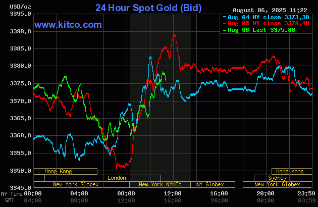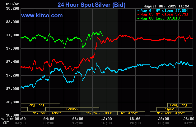 (Kitco News, Wed. Aug. 6th, 2025) – Gold prices are trading around steady near midday Wednesday, while silver prices are modestly up. Some early profit-taking pressure was met by bullish gold traders buying the dip and doing some bargain buying. Somewhat improved trader/investor risk appetite in the general marketplace at mid-week did limit the upside in both safe-haven metals. December gold was last up $0.60 at $3,435.50. September silver prices were last up $0.182 at $38.01.