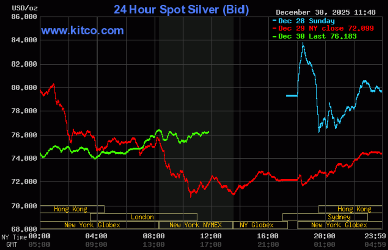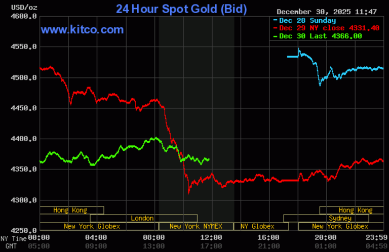 (Kitco News, Tuesday. Dec. 30th, 2025) – Gold prices are higher and silver prices are strongly higher near midday Tuesday. Both metals have made impressive rebounds from Monday’s huge losses. Geopolitical tensions are on the rise as the year winds down, which is prompting safe-haven demand for the two precious metals. February gold was last up $40.70 at $4,383.90. March silver prices were up $5.75 at $76.23.