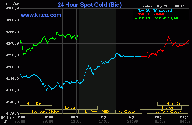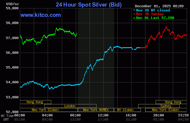 (Kitco News, Monday. Dec. 1st, 2025) – Gold and silver prices are higher in early U.S. trading Monday, with gold scoring a six-week high and silver an all-time record high. Safe-haven demand is featured to start the trading week and the new month, amid bond market jitters that have originated from Japan. Chart-based buying is also featured in both metals as their near-term technical postures have become more bullish recently. February gold was last up $28.20 at $4,283.40. March silver prices were up $0.597 at $57.77 after hitting a contract/record high of $58.61 overnight.