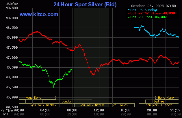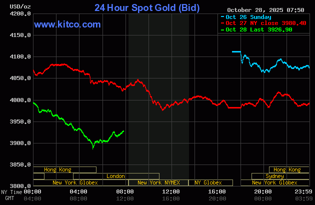 (Kitco News, Tuesday. Oct . 28th, 2025) – Gold and silver prices are again sharply lower in early U.S. trading Tuesday, on follow-through selling pressure from Monday’s steep losses. Both gold and silver hit three-week lows overnight. As the U.S. and China are close to a major trade agreement, keener risk appetite is now in the marketplace. The U.S. stock indexes hit record highs overnight. Technical selling is also ramping up in both metals as serious near-term chart damage has been inflicted to suggest near-term market tops are in place. December gold was last down $82.30 at $3,937.10. December silver prices were down $0.449 at $46.325.