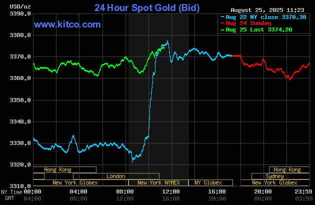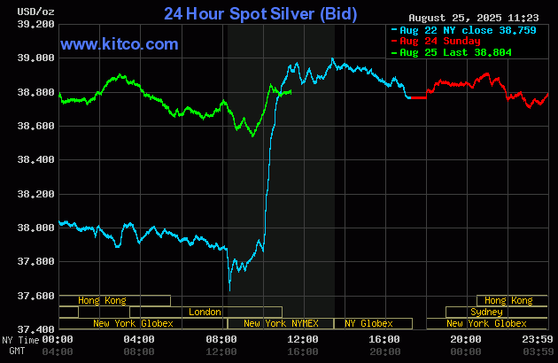(Kitco News, Monday. Aug 25th, 2025) – Gold prices are near steady and silver prices are modestly down near midday Monday. It’s a quieter, late-summer trading day for the precious metals markets to start the trading week and following a more active trading session Friday. December gold was last up $1.50 at $3,420.00. September silver prices were down $0.229 at $38.83.