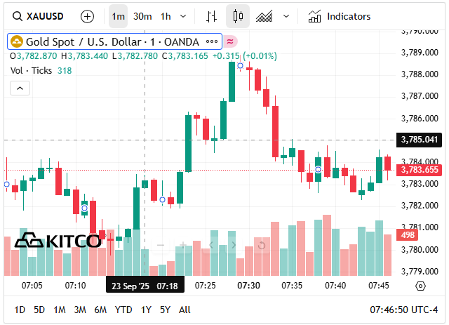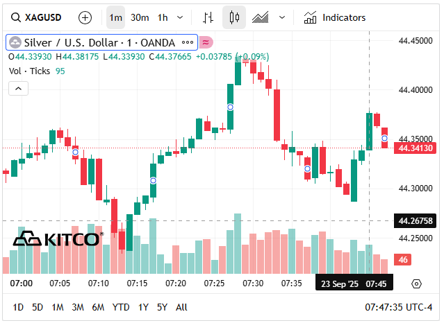 (Kitco News, Tuesday. Sep. 23rd, 2025) – Gold prices are sharply up in early U.S. trading Monday and hit another record high. Silver prices are also up and notched another 14-year high. The powerful but mature bull market runs in gold and silver are accelerating. That’s one early clue that from a time perspective, major market tops could come sooner rather than later. However, from a price perspective, there still could be much more room on the upside for gold and silver prices during this acceleration phase of the mature bull markets, before they peter out for a while. December gold was last up $40.80 at $3,815.90. December silver prices were up $0.361 at $44.575.