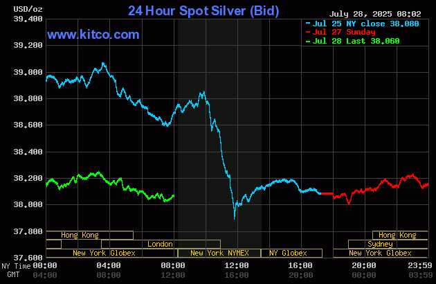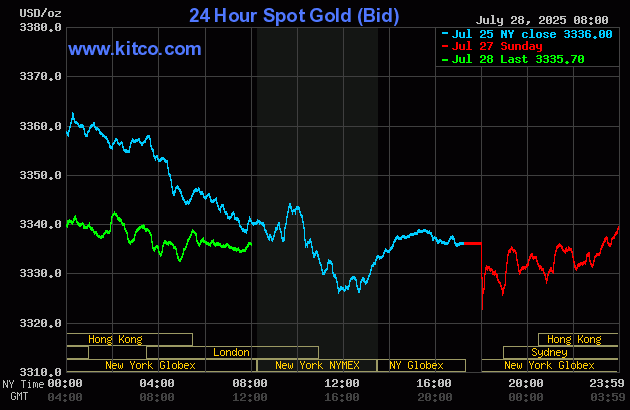 (Kitco News, Monday. July 28th, 2025) – Gold and silver prices are near steady to start the trading week. That’s not too disappointing for the precious metals bulls, given the stronger U.S. dollar index today and that risk appetite is strong enough to have pushed the major U.S. stock indexes to record highs overnight. August gold was last up $0.10 at $3,335.90. September silver prices were last down $0.115 at $38.25.