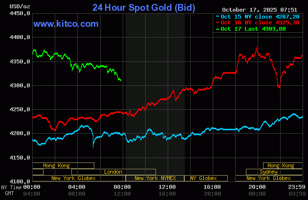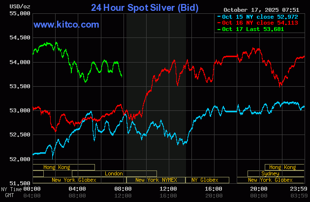 (Kitco News, Friday. Oct. 17th, 2025) – Gold prices are higher and hit another all-time high overnight, at $4,392.00, basis December Comex futures, but have since backed off the high. Silver prices are lower after overnight scoring a record high of $53.765. There is keener risk aversion in the general marketplace to end the week, which is driving even more safe-haven demand to the yellow metal. The regional U.S. banking sector is wobbly late this week. The silver bulls do appear to be at least near-term exhausted late this week. December gold was last up $18.70 at $4,321.10. December silver prices were down $0.726 at $52.425.