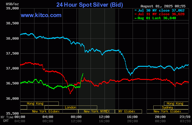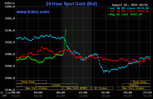 (Kitco News, Friday. Aug. 1st, 2025) – Gold prices are sharply higher in early U.S. trading Friday, following a very downbeat U.S. economic report that fell squarely into the camp of the monetary policy doves. December gold was last up $48.60 at $3,397.20. September silver prices were last up $0.243 at $36.955.