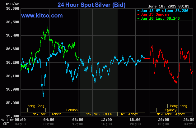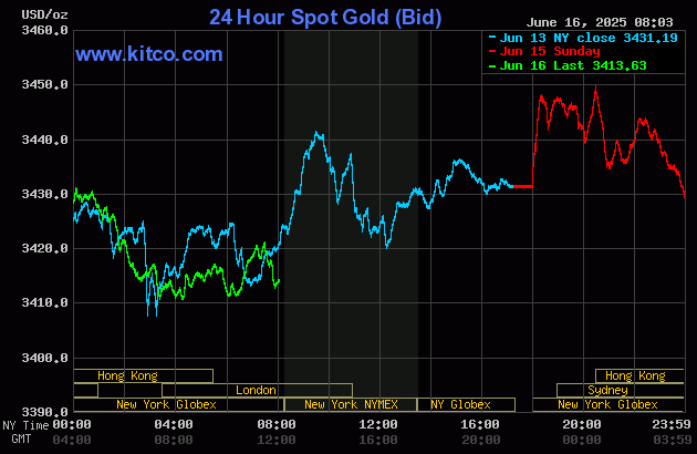 (Kitco News, Monday. June 16th, 2025) – Gold prices are lower in early U.S. trading Monday, after hitting a five-week high overnight. Risk appetite has improved a bit to start a U.S. holiday-shortened trading week, evidenced by higher stock markets in the U.S. and overseas. Silver prices are near steady. August gold was last down $20.30 at $3,432.50. July silver prices were steady at $36.355.