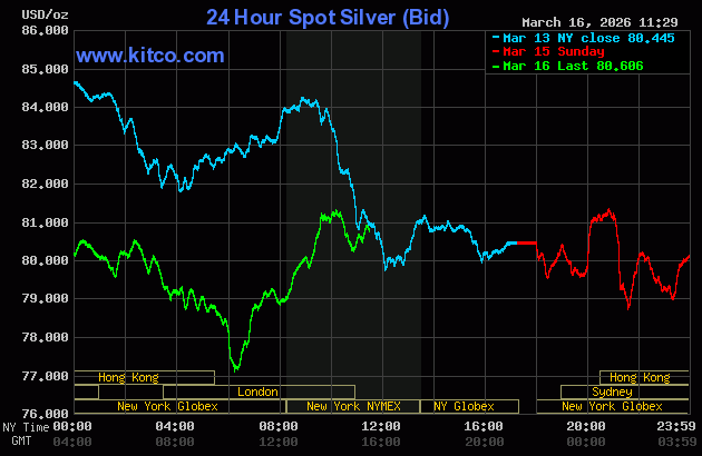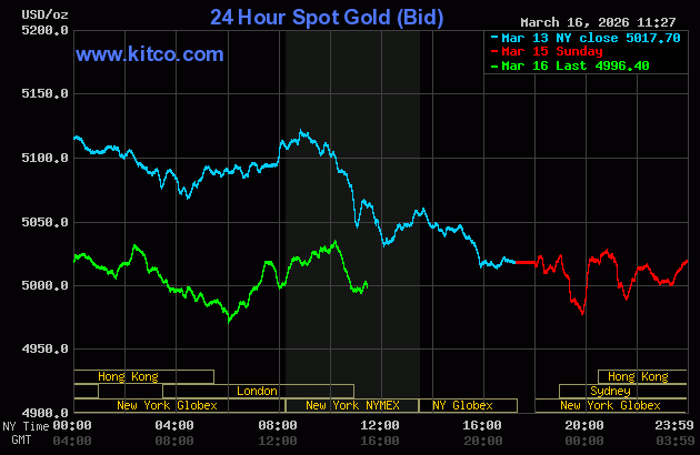 (Kitco News, Monday. Mar. 16th. 2026) – Gold and silver prices are lower near midday Monday, but prices are up from their daily lows. The metals are seeing price pressure amid a sell off in the crude oil market and a solid rebound in the U.S. stock indexes today. Worries about rising inflation due to the Middle East war have also been limiting buying interest in gold and silver. April gold was last down $56.30 at $5,005.30. May silver prices were down $0.308 at $81.01.