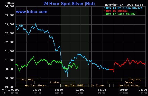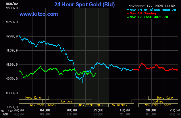 (Kitco News, Monday. Nov. 17th, 2025) – Gold and silver prices are weaker in midday U.S. trading Monday. The recent lack of fresh, bullish fundamental news for the safe-haven metals has the bulls timid, especially with gold and silver prices still at historically elevated levels. Precious metals traders are looking forward to a week in which U.S. government economic data will start to flow again. December gold was last down $30.50 at $4,063.80. December silver prices were down $0.231 at $50.45.