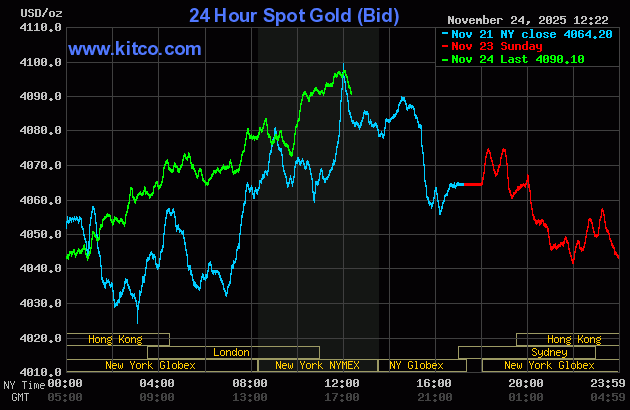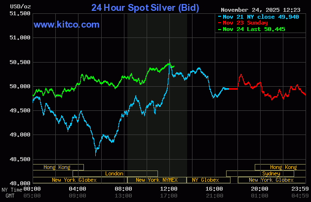 (Kitco News, Mon. Nov. 24th, 2025) – Gold and silver prices are higher in midday U.S. trading Monday, in a quieter start to a U.S.-holiday-shortened trading week. Traders and investors are awaiting a heavy slate of U.S. economic data due to be released Tuesday and Wednesday. December gold was last up $16.60 at $4,096.20. December silver prices were up $0.342 at $50.245.