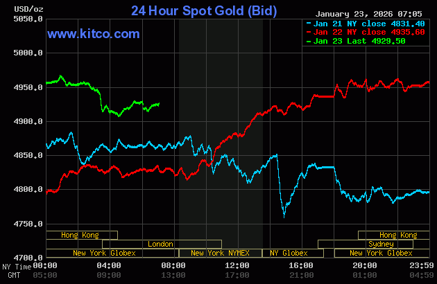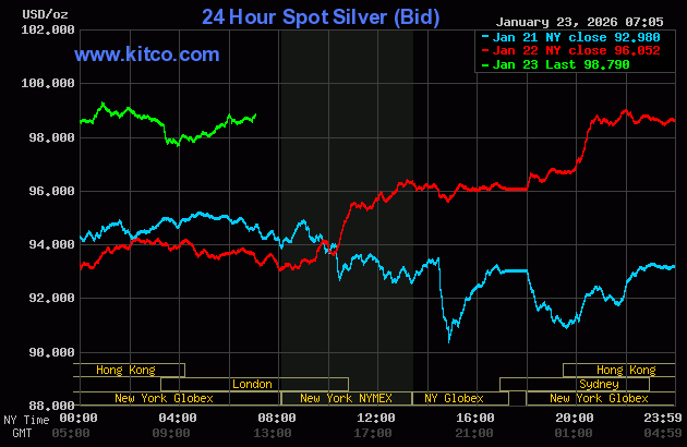 (Kitco News, Friday. Jan. 23rd, 2026) – Gold prices a bit higher in early U.S. trading and silver prices are soaring and closing in on $100.00 an ounce. Both metals hit new all-time highs overnight. Ongoing safe-haven demand and chart-based buying amid firmly bullish technicals continue to drive the precious metals prices north. February gold was last up $11.10 at $4,924.50. March silver prices were up $2.413 at $98.78.