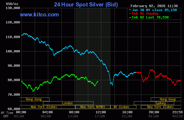 (Kitco News, Mon. Feb. 2nd, 2026) – Gold and silver prices are lower and in the middle of their wide daily trading ranges in midday U.S. trading Monday, after dropping to four-week lows overnight and in the aftermath of last Friday’s record-setting session. April gold was last down $39.70 at $4,707.50. March silver prices were down $0.61 at $77.90.
