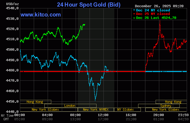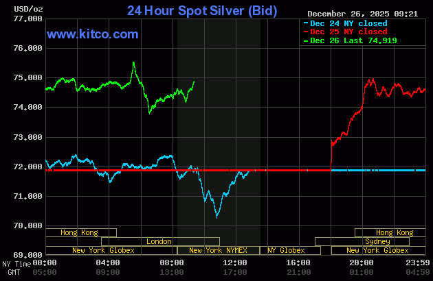 (Kitco News, Friday. Dec. 26th, 2025) – Gold and silver prices are higher, with silver strongly up, and hit new record highs in early U.S. trading Friday. More safe-haven demand and bullish technical charts are fueling the two metals. February gold was last up $53.50 at $4,557.40 after hitting a new high of $4,562.70 overnight. March silver prices were up $3.01 at $74.675 and hit a new high of $75.84 overnight.