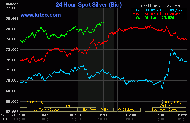 (Kitco News) – Gold and silver prices are higher near midday U.S. trading today, with gold posting solid gains and silver moderate gains. A lower U.S. dollar index at midweek, along with a dip in world government bond prices, are bullish outside-markets for the two precious metals on this day. June gold was last up $130.50 at $4,808.70. May silver prices were up $0.936 at $75.86.