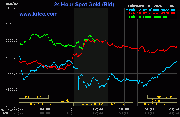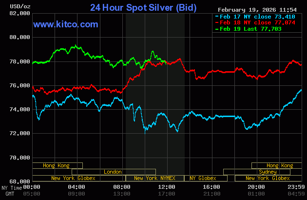 (Kitco News, Thurs. Feb. 19th, 2026) – Gold and silver prices are trading modestly up near midday Thursday. Precious metals markets are pausing late this week as the marketplace is focused on the U.S. firepower build-up in the Middle East. April gold was last up $8.80 at $5,018.00. March silver prices were up $0.422 at $78.01.