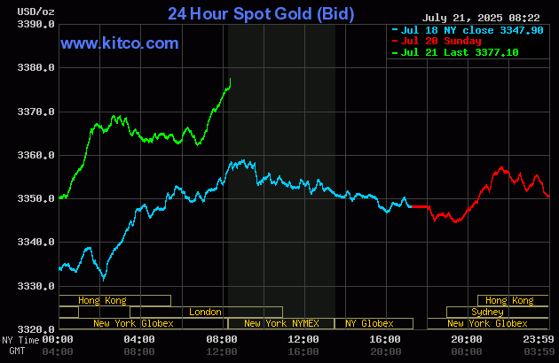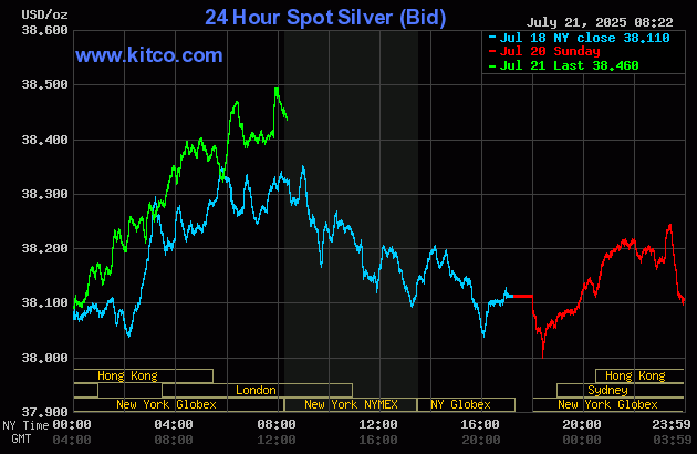 (Kitco News, Mon. July 20th, 2025) – Gold and silver prices are posting good gains in early U.S. trading Monday. The precious metals are being supported by a lower U.S. dollar index and a dip in U.S. Treasury yields to start the trading week. August gold was last up $25.90 at $3,383.90. September silver prices were last up $0.416 at $38.88.