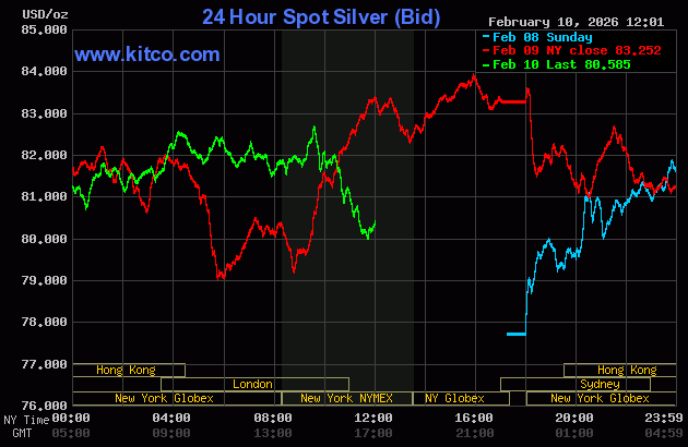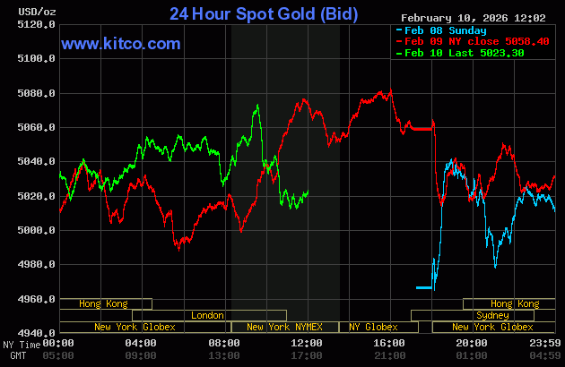 (Kitco News, Tuesday. Feb. 10th, 2026) – Gold and silver prices are lower in midday U.S. trading Tuesday, with silver leading to the downside. Profit taking from the shorter-term futures traders is featured today, following recent price rebounds. The precious metals markets are also seeing some position evening ahead of the U.S. jobs report on Wednesday and some U.S. inflation data late this week. April gold was last down $10.00 at $5,069.00. March silver prices were down $0.514 at $81.75.