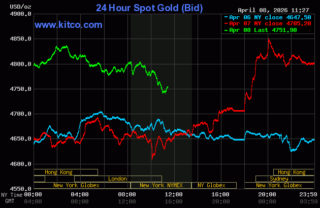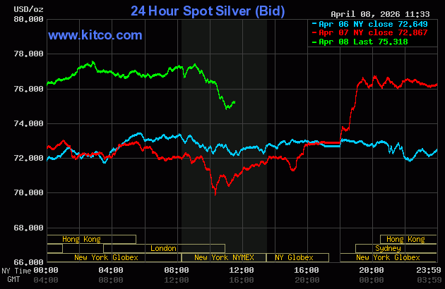 (Kitco News, Wed. April 8th, 2026) – Gold and silver prices are down a bit in early U.S. trading today, ahead of a U.S.-imposed deadline of this evening for Iran to open the Strait of Hormuz, or else. June gold was last down $11.20 at $4,673.00. May silver prices were down $0.792 at $72.07.