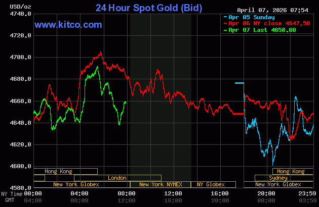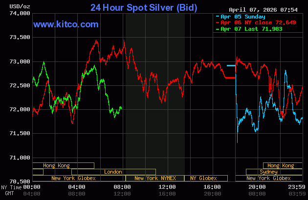 (Kitco News, Tuesday. April 7th, 2026) – Gold and silver prices are down a bit in early U.S. trading today, ahead of a U.S.-imposed deadline of this evening for Iran to open the Strait of Hormuz, or else. June gold was last down $11.20 at $4,673.00. May silver prices were down $0.792 at $72.07.
