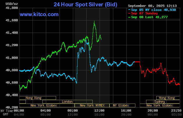 (Kitco News, Tuesday. Sep. 9th, 2025) – Gold prices are near steady and silver prices lower near midday. Profit taking is featured today after gold earlier in the day hit new contract/record highs. Silver prices are lower, also on profit taking after hitting a 14-year high on Monday. Bullish fundamentals and bullish technical charts are likely to continue to fuel the bull market runs in both precious metals. December gold was last up $1.80 at $3,679.00. December silver prices were down $0.517 at $41.385.