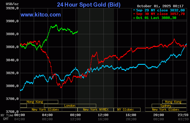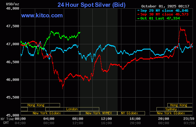 (Kitco News, Wed. Oct. 1st, 2025) – Gold and silver prices are solidly up in early U.S. trading Wednesday, with gold hitting another record high and silver another 14-year high. Safe-have bidding is featured at mid-week as the U.S. government has shut down. December gold was last up $37.80 at $3,911.00. December silver prices were up $0.925 at $47.565.