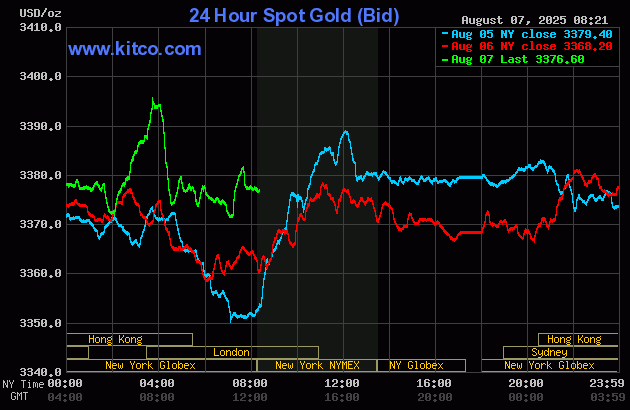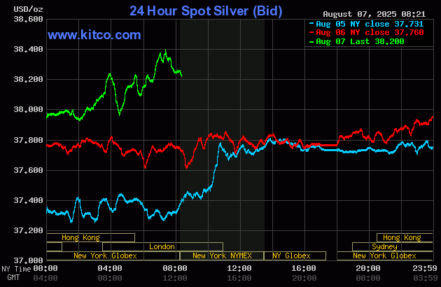(Kitco News, Thurs. Aug. 7th, 2025) – Gold and silver prices are higher and hit two-week highs in early U.S. trading Thursday. News that China’s central bank continues to add to its gold reserves and more bullish near-term technical postures in both gold and silver recently are supporting buying interest in the metals today. December gold was last up $20.00 at $3,453.50. September silver prices were last up $0.70 at $38.58.