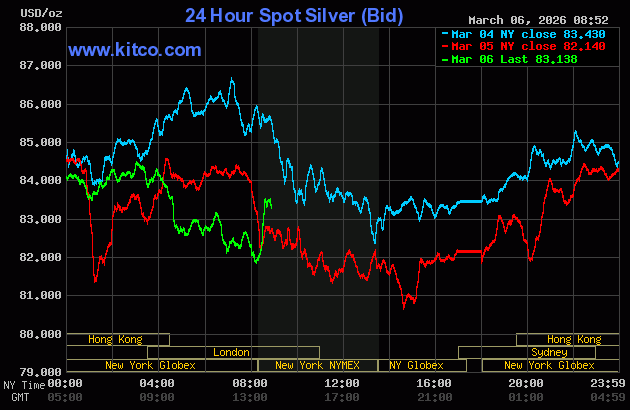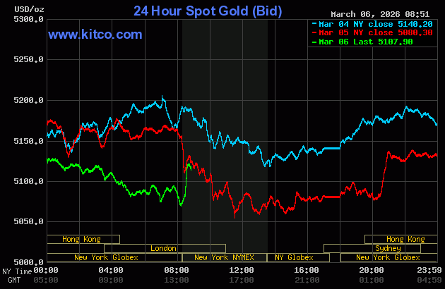 (Kitco News, Friday. Mar. 6th, 2026) – Gold and silver prices are posting modest gains in early U.S. trading Friday, following the U.S. jobs report for February that showed a big miss to the downside on non-farm payrolls. Some safe-haven demand is also featured amid the Iran war that has elevated risk aversion in the general marketplace. April gold was last up $49.00 at $5,128.00. May silver prices were up $1.934 at $84.10.