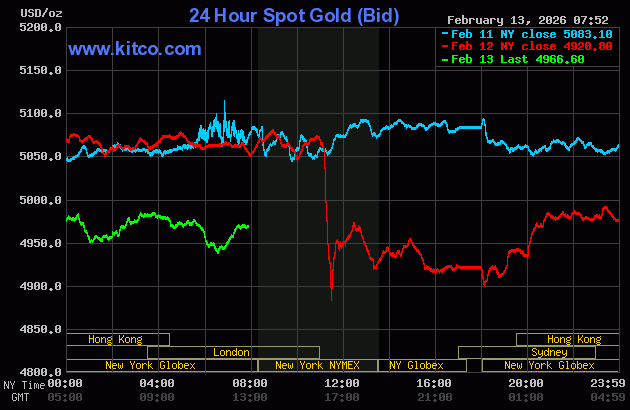 (Kitco News, Friday. Feb. 13th, 2026) – Gold and silver prices are higher in early U.S. trading Friday, just ahead of one of the major the U.S. economic data points of the month: the consumer price index. April gold was last up $43.20 at $4,992.60. March silver prices were up $1.688 at $77.35.