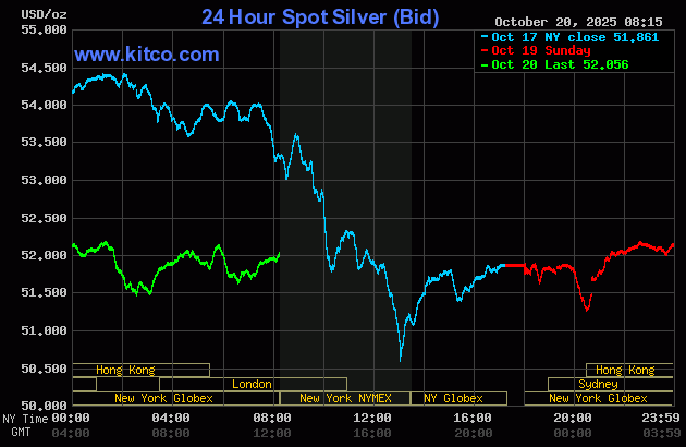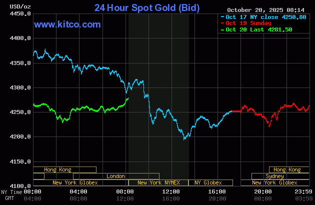 (Kitco News, Monday. Oct. 20th, 2025) – Gold and silver prices are solidly higher on corrective bounces after strong selling pressure on Friday that did produce some near-term technical damage. Better risk appetite in the general marketplace to start the trading week may cap the upside for both metals. December gold was last up $69.30 at $4,282.50. December silver prices were up $0.701 at $50.79.