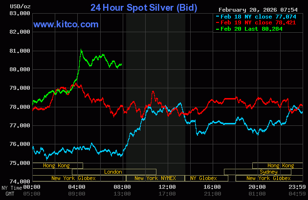 (Kitco News, Friday. Feb.20th, 2026 ) – Gold prices are trading modestly up and silver prices sharply up in early U.S. trading Friday. Safe-haven demand is featured in the two metals as the U.S. appears to be on the brink of war with Iran. April gold was last up $43.80 at $5,041.20. March silver prices were up $2.631 at $80.26.