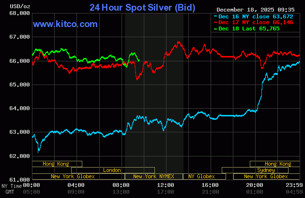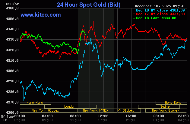 (Kitco News,Thurs. Dec.18th, 2025) – Gold and silver prices are lower in early U.S. trading Thursday, on some routine profit taking from the shorter-term futures traders following recent gains that pushed silver to a record high Wednesday. Precious metals traders are awaiting a key U.S. inflation report out shortly. February gold was last down $20.00 at $4,353.80. March silver prices were down $0.746 at $66.16.