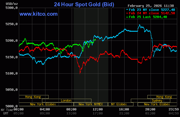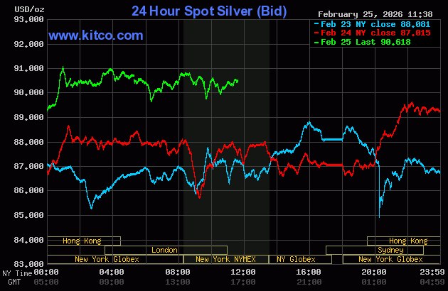 (Kitco News, Thurs. Mar. 26th, 2026) – Gold and silver prices are higher near midday Wednesday, with silver once again leading the way with solid gains and scoring a three-week high. The near-term technical postures for both precious metals have become more bullish recently, which is inviting the chart-based traders to the long sides again. Safe-haven demand is also featured in gold and silver, amid a still-uncertain geopolitical environment. April gold was last up $37.40 at $5,214.50. March silver prices were up $2.954 at $90.43.