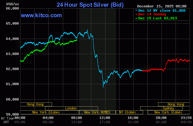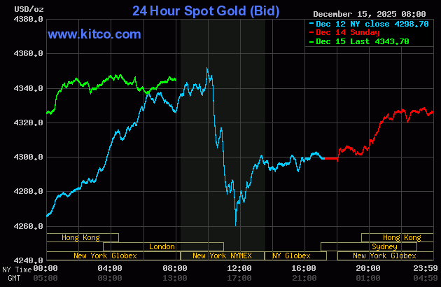 (Kitco News, Monday. Dec. 15th, 2025) – Gold and silver prices are solidly higher in early U.S. trading Monday. Both markets are not far below their record highs. The two precious metals are seeing solid technical buying and are also benefiting a weakening U.S. dollar index. February gold was last up $51.90 at $4,380.00. March silver prices were up $1.958 at $63.955.