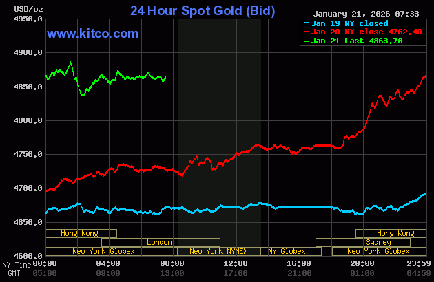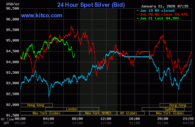 (Kitco News, Wed. Jan 21st, 2026) – Gold prices strongly higher and hit another new all-time high overnight, on safe-haven demand amid risk aversion pervading the general marketplace. Silver prices are weaker on profit taking from the shorter-term futures traders. February gold was last up $94.30 at $4,860.00. March silver prices were down $0.451 at $94.18.